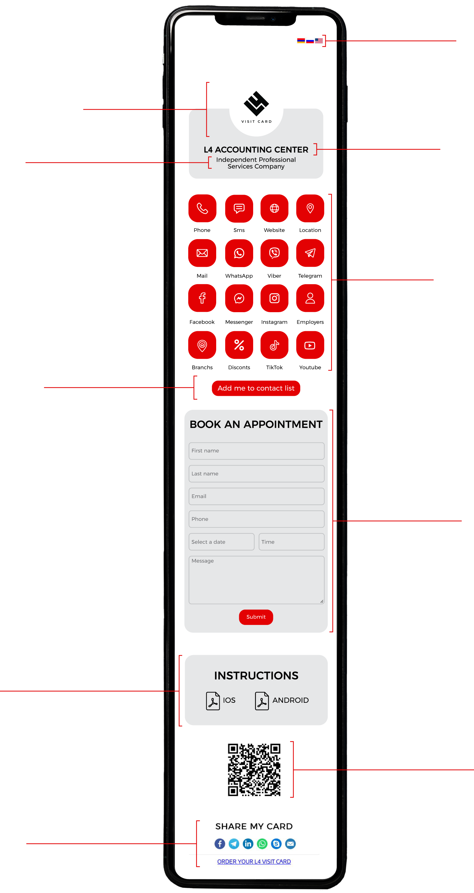 You no longer need to write down your phone number, data, social media, website on paper, as all these features are included in the L4 VISIT CARD's. You will enter the Card application with one touch using the NFC system or QR code